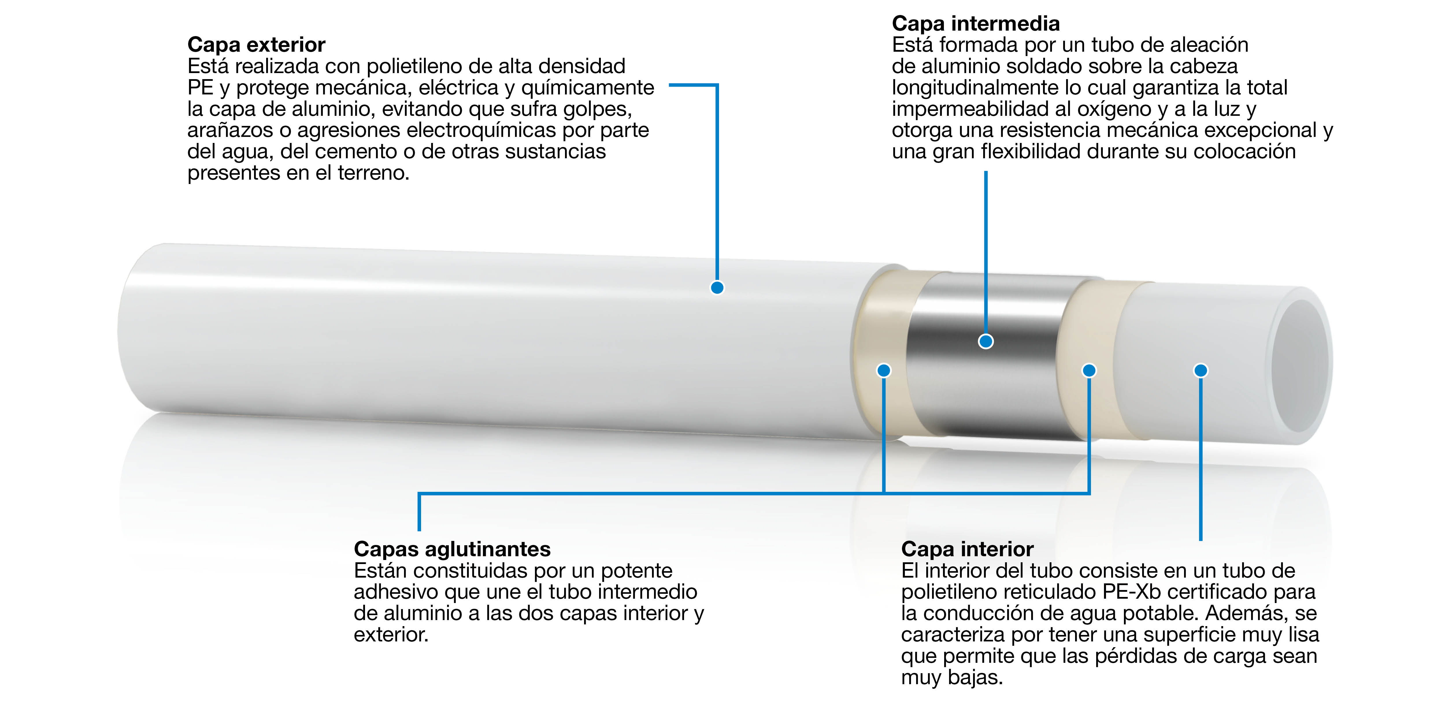 El resultado es un producto formado por distintas capas de material acopladas entre sí que permiten obtener excelentes propiedades que no puede alcanzar una tubería formada por un solo material.